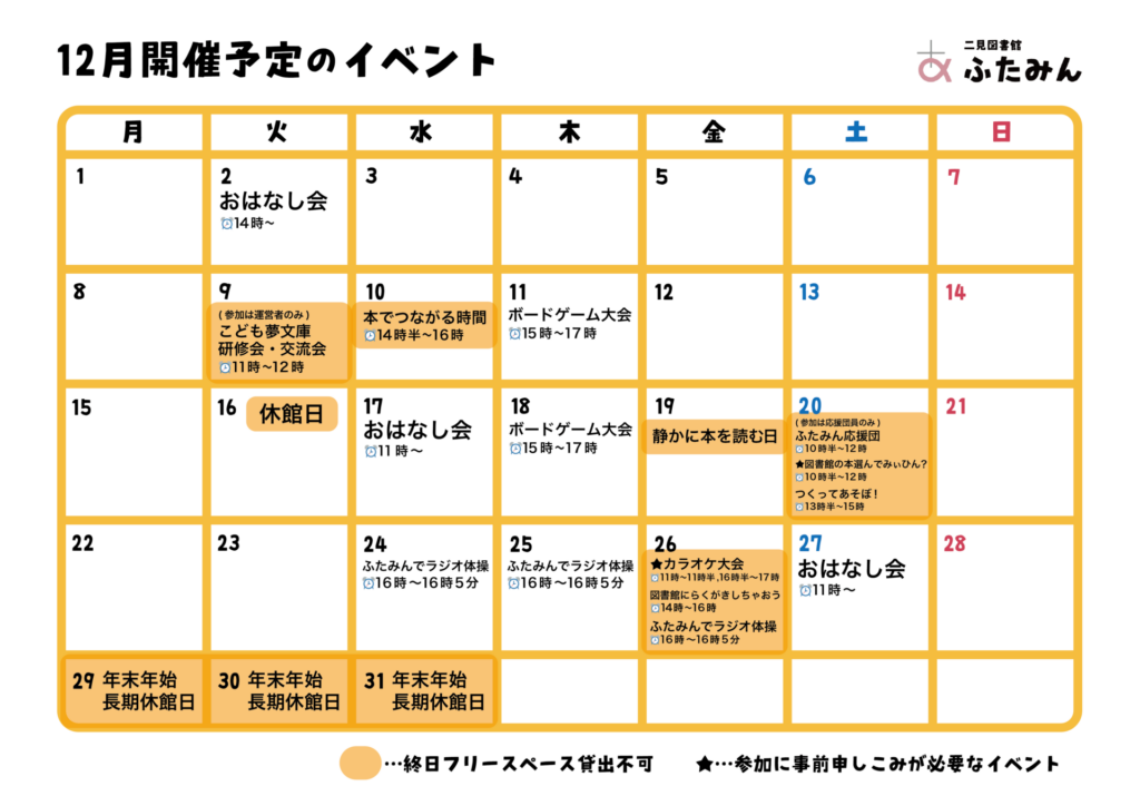各イベントの詳細につきましては、館内のイベントポスターもしくはふたみん公式Instagramをご覧ください。