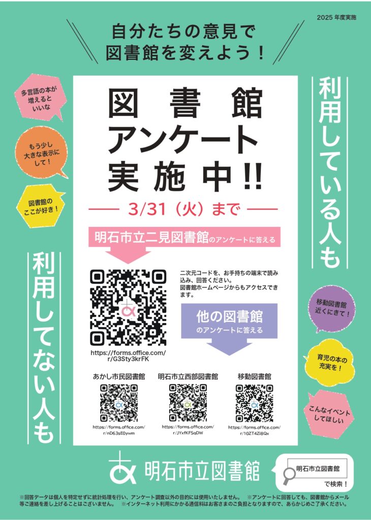 現在、明石市立図書館では図書館アンケートを実施しています。