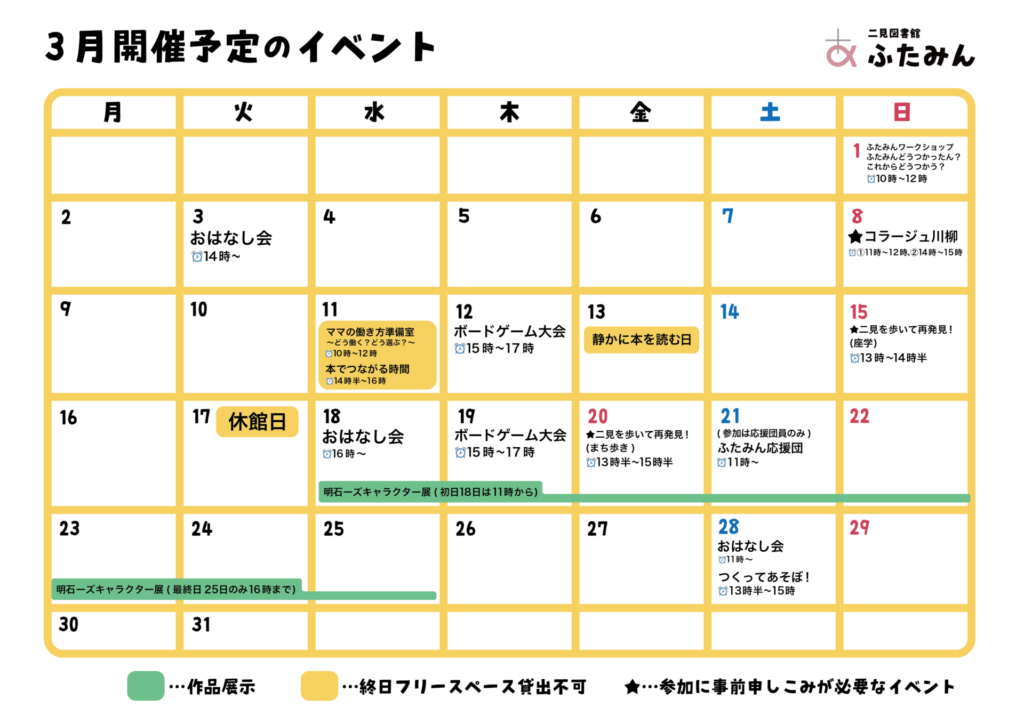 各イベントの詳細につきましては、館内のイベントポスターもしくはふたみん公式Instagramをご覧ください。