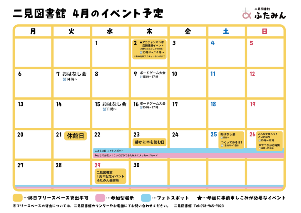 各イベントの詳細につきましては、館内のイベントポスター、もしくはふたみん公式Instagramをご覧ください。